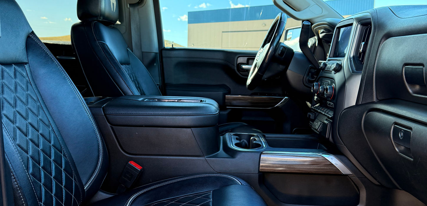 The professional Rocky Ridge upfit transforms this Silverado into a high-clearance off-road beast, centered around a 6-inch suspension lift system and FOX 2.0 Adventure Series rear shocks. This setup allows for a commanding view of the road and superior dampening over rough terrain, while the 35-inch All-Terrain tires mounted on 20-inch custom Rocky Ridge wheels ensure maximum grip and a rugged stance. To maintain a seamless factory appearance, color-matched smooth fender flares have been added, alongside functional upgrades like wheel-to-wheel side steps and Bluetooth-controlled RGB rock lights. The attention to detail extends to the cabin with custom-stitched headrests and a branded gauge cluster, making this a turn-key, premium pickup that is just as comfortable on a long highway haul as it is navigating a backroad.
